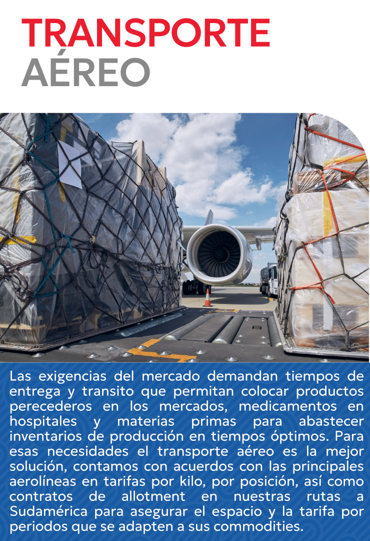 Las exigencias del mercado actual están cambiando y demandan tiempos de entrega y transito que permitan colocar productos perecederos en los mercados, medicamentos en hospitales y materias primas para abastecer inventarios de producción en tiempos óptimos. Para esas necesidades el transporte aéreo es la mejor solución, en GSM contamos con acuerdos con las principales aerolíneas en tarifas por kilo, por posición, así como contratos de allotment en nuestras rutas a Sudamérica para asegurar el espacio y la tarifa por periodos que se adapten a sus commodities.