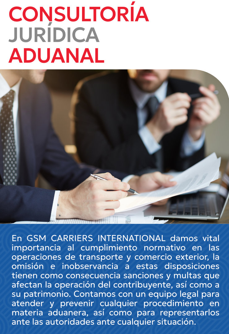 En GSM CARRIERS INTERNATIONAL damos vital importancia al cumplimiento normativo en las operaciones de transporte y comercio exterior, la omisión e inobservancia a estas disposiciones tienen como consecuencia sanciones y multas que afectan la operación del contribuyente, así como a su patrimonio. Contamos con un equipo legal para atender y prevenir cualquier procedimiento en materia aduanera, así como para representarlos ante las autoridades ante cualquier situación.
