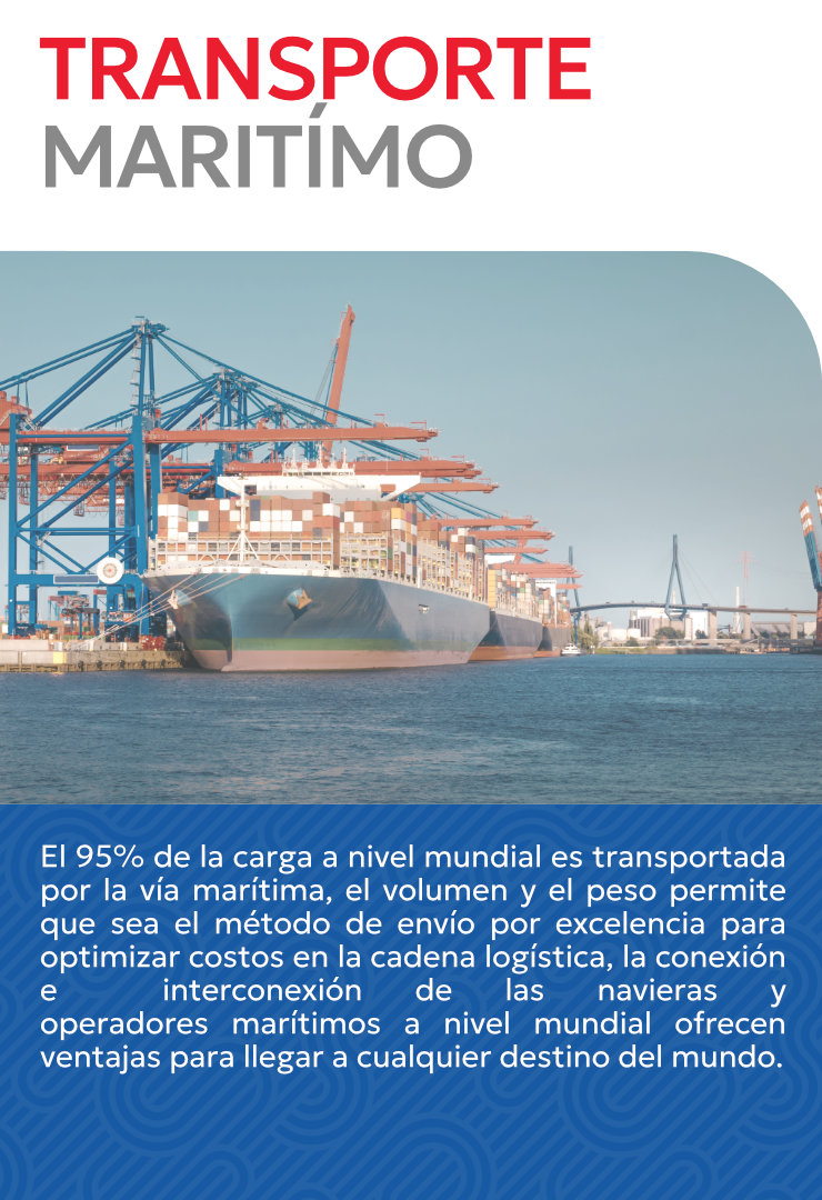 El 95% de la carga a nivel mundial es transportada por la vía marítima, el volumen y el peso permite que sea el método de envío por excelencia para optimizar costos en la cadena logística, la conexión e interconexión de las navieras y operadores marítimos a nivel mundial ofrecen ventajas para llegar a cualquier destino del mundo.