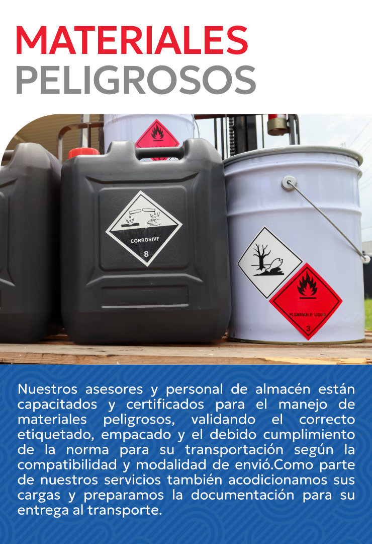 Nuestros asesores y personal de almacén están capacitados y certificados para el manejo de materiales peligrosos, validando el correcto etiquetado, empacado y el debido cumplimiento de la norma para su transportación según la compatibilidad y modalidad de envió.Como parte de nuestros servicios también acodicionamos sus cargas y preparamos la documentación para su entrega al transporte.
