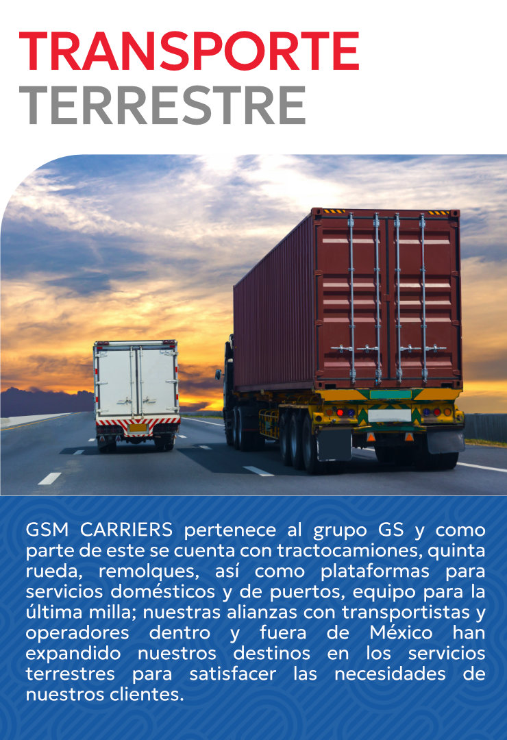 GSM CARRIERS pertenece al grupo GS y como parte de este se cuenta con tractocamiones, quinta rueda, remolques, así como plataformas para servicios domésticos y de puertos, equipo para la última milla; nuestras alianzas con transportistas y operadores dentro y fuera de México han expandido nuestros destinos en los servicios terrestres para satisfacer las necesidades de nuestros clientes.